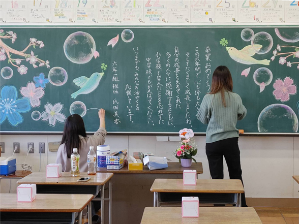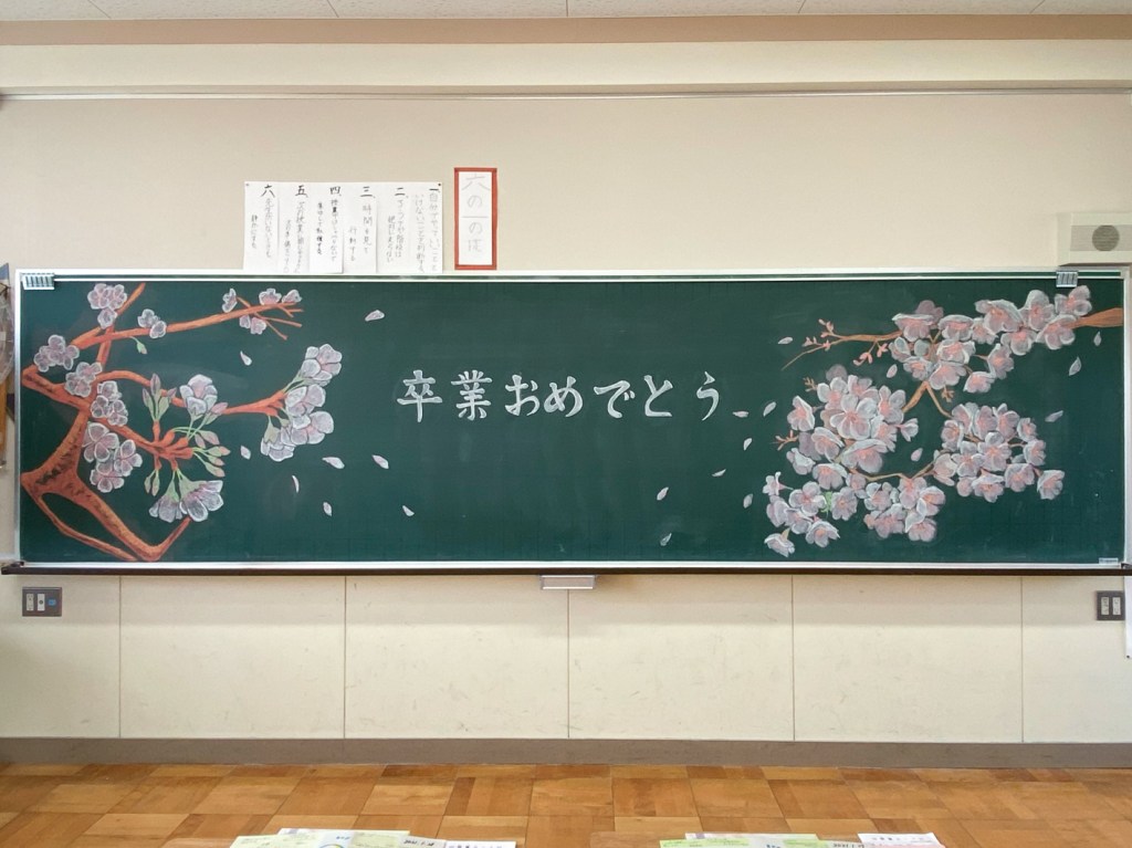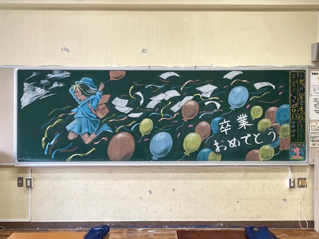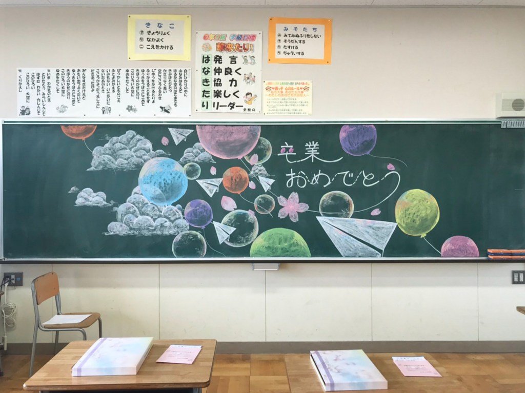 卒業する小学生のために、黒板アートで教室をいろどりました。
