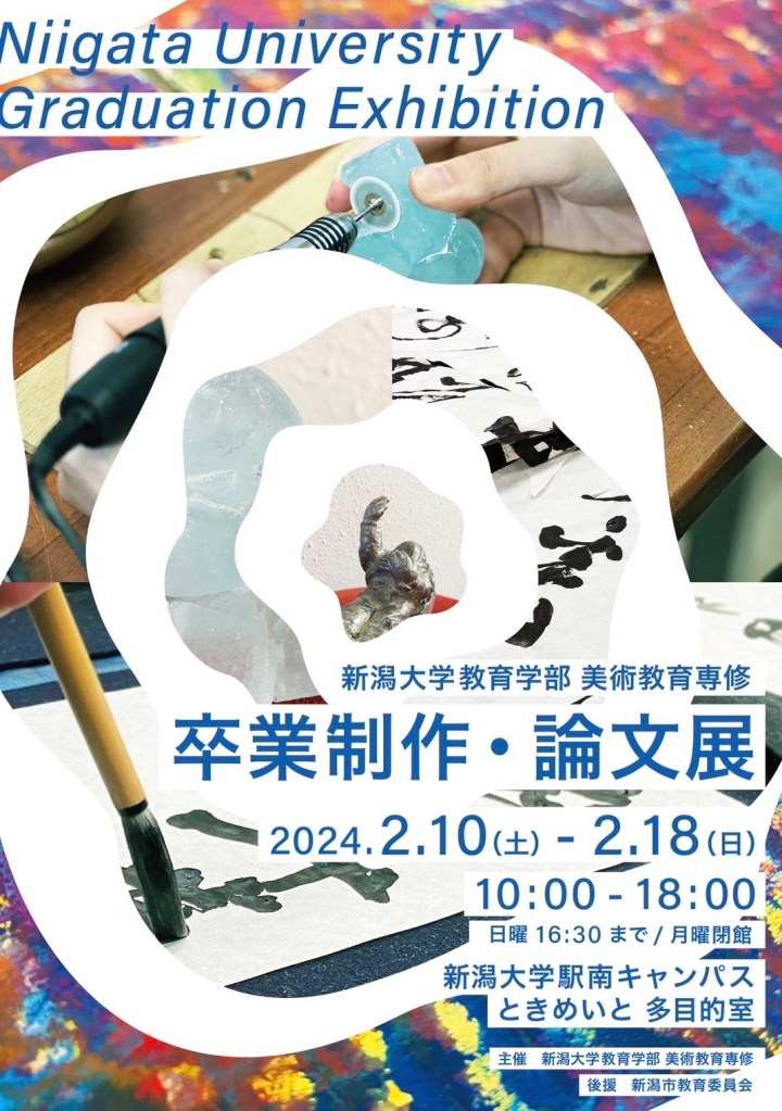 令和5年度 卒業制作・論文展 投稿者:新潟大学教育学部美術教育専修2024-02-062024-05-14カテゴリー:2024、展覧会 令和5年度卒業制作・論文展を開催しました。絵画、彫刻、工芸、書道の作品や、論文パネルの発表を行いました。【卒業制作・論文展】日時 2024年2月10日(土)~20日(日)開場時間 10:00〜18:00(日曜は16:30閉館) 月曜休館場所 新潟大学駅南キャンパスときめいと 多目的室入場無料アクセス 新潟駅南口から徒歩3分 PLAKA1(2階)