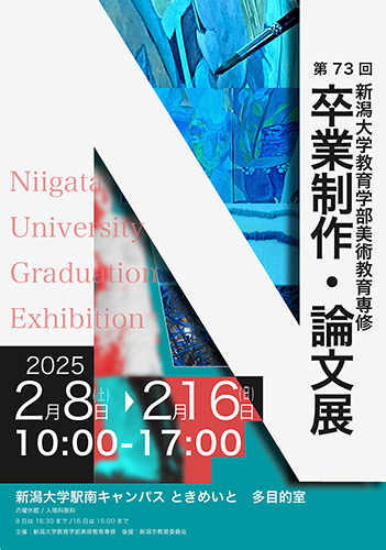 令和6年度 卒業制作・論文展 投稿者:新潟大学教育学部美術教育専修2025-02-202025-03-25カテゴリー:2025年、展覧会 令和5年度卒業制作・論文展を開催しました。4年次には作品制作・論文(美術教育や美術史)のどちらかを選択し、卒業研究に取り組みます。制作の学生は作品を、論文の学生は論文発表ポスターを会場に展示し、広く一般に公開しています。【卒業制作・論文展】日時 2025年2月8日(土)~16日(日)開場時間 10:00〜18:00(日曜は16:30閉館) 月曜休館場所 新潟大学駅南キャンパスときめいと 多目的室