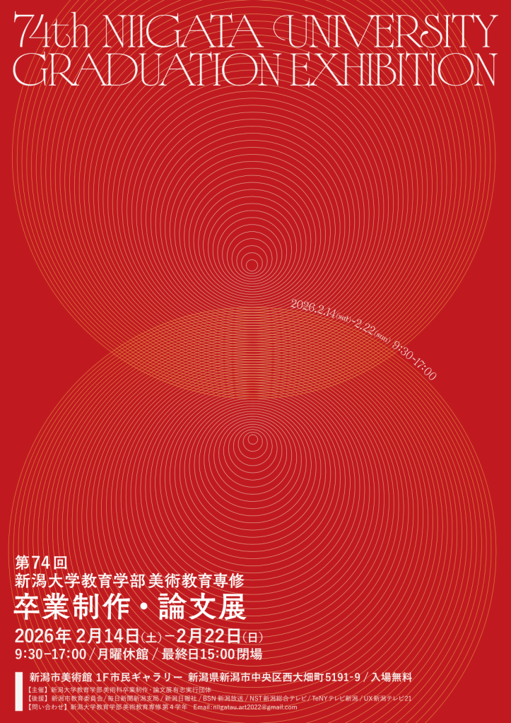 令和7年度 卒業制作・論文展 投稿者:新潟大学教育学部美術教育専修2026-02-052026-02-05カテゴリー:2026、展覧会 令和7年度卒業制作・論文展を開催します。4年次には作品制作・論文(美術教育や美術史)のどちらかを選択し、卒業研究に取り組みます。制作の学生は作品を、論文の学生は論文発表ポスターを会場に展示し、広く一般に公開しています。【第74回新潟大学教育学部美術教育専修 卒業制作・論文展】日時 2026年2月14日(土)~2月22日(日)16日休館日開場時間 9:30~17:00場所 新潟市美術館 1階 市民ギャラリー